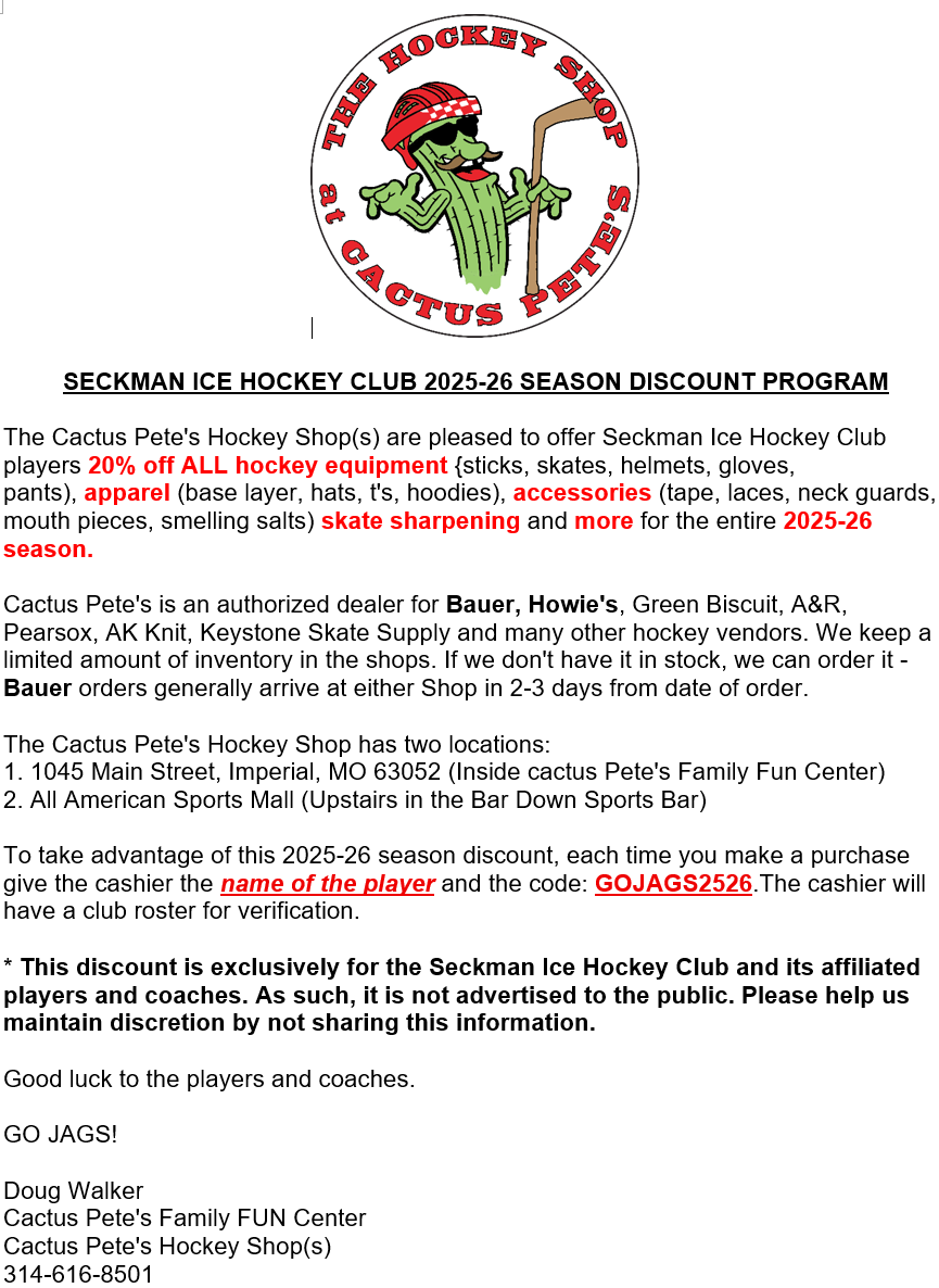 When visiting or scheduling skate sharpening's with either Cactus Pete's or SK8DR, make sure to tell them your name and that you are a current rostered player for Seckman Hockey.